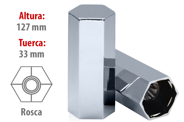 - Tipo rosca alta. - Terminación diseño hexagonal. - En material ABS cromado. - Accesorio cromado de lujo. Información adicional Tuerca: 33 mm Terminación: Diseño hexagonal.
